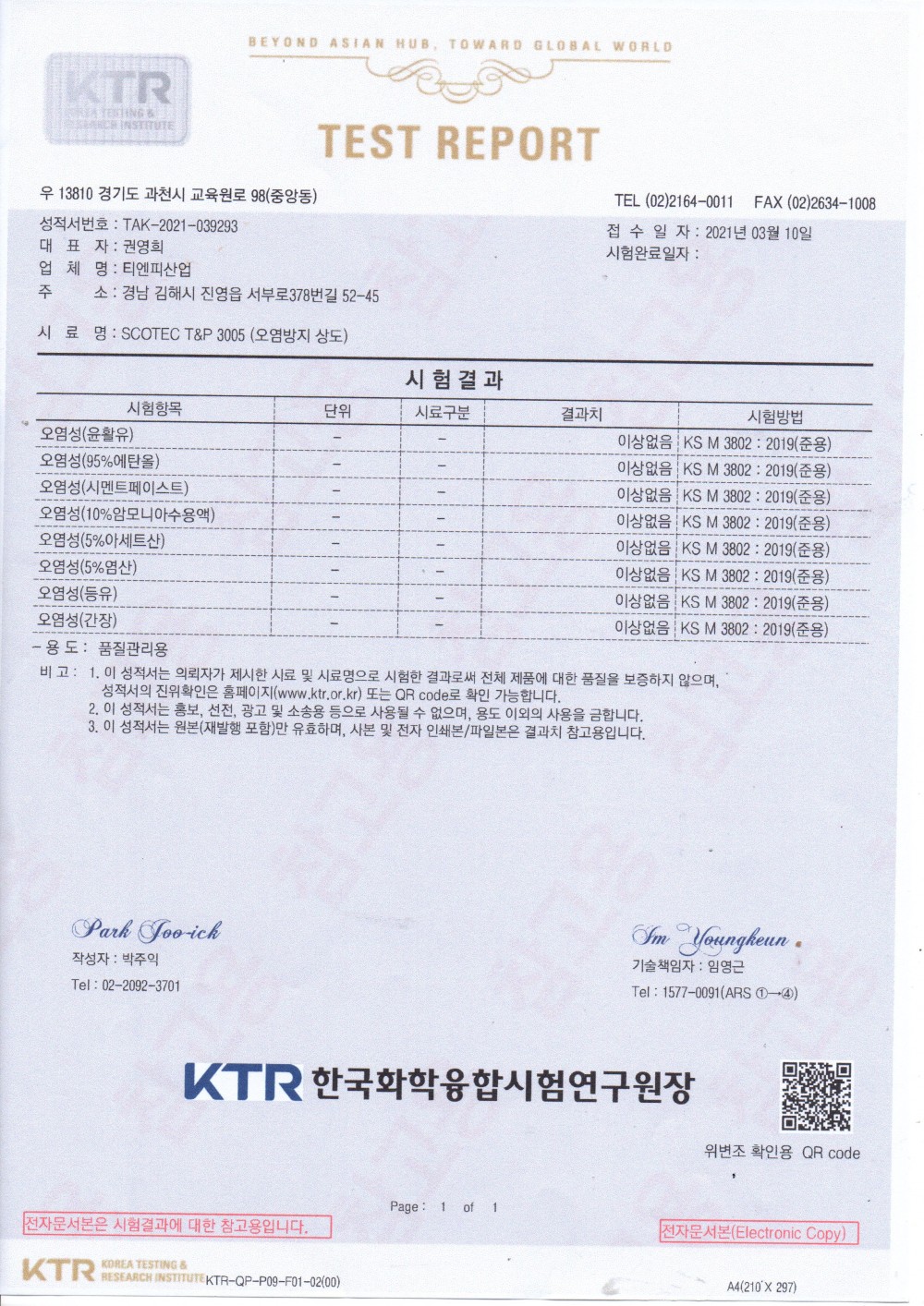 KTR 시험성적서 [오염성] 페이지 정보 작성자 관리자 댓글 댓글 0건 조회Hit 93회 작성일Date 24-02-05 16:10 본문 목록 이전글단체표준인증서 [도막형 바닥재] 24.02.05 다음글KTR 시험성적서 [내연성] 24.02.05