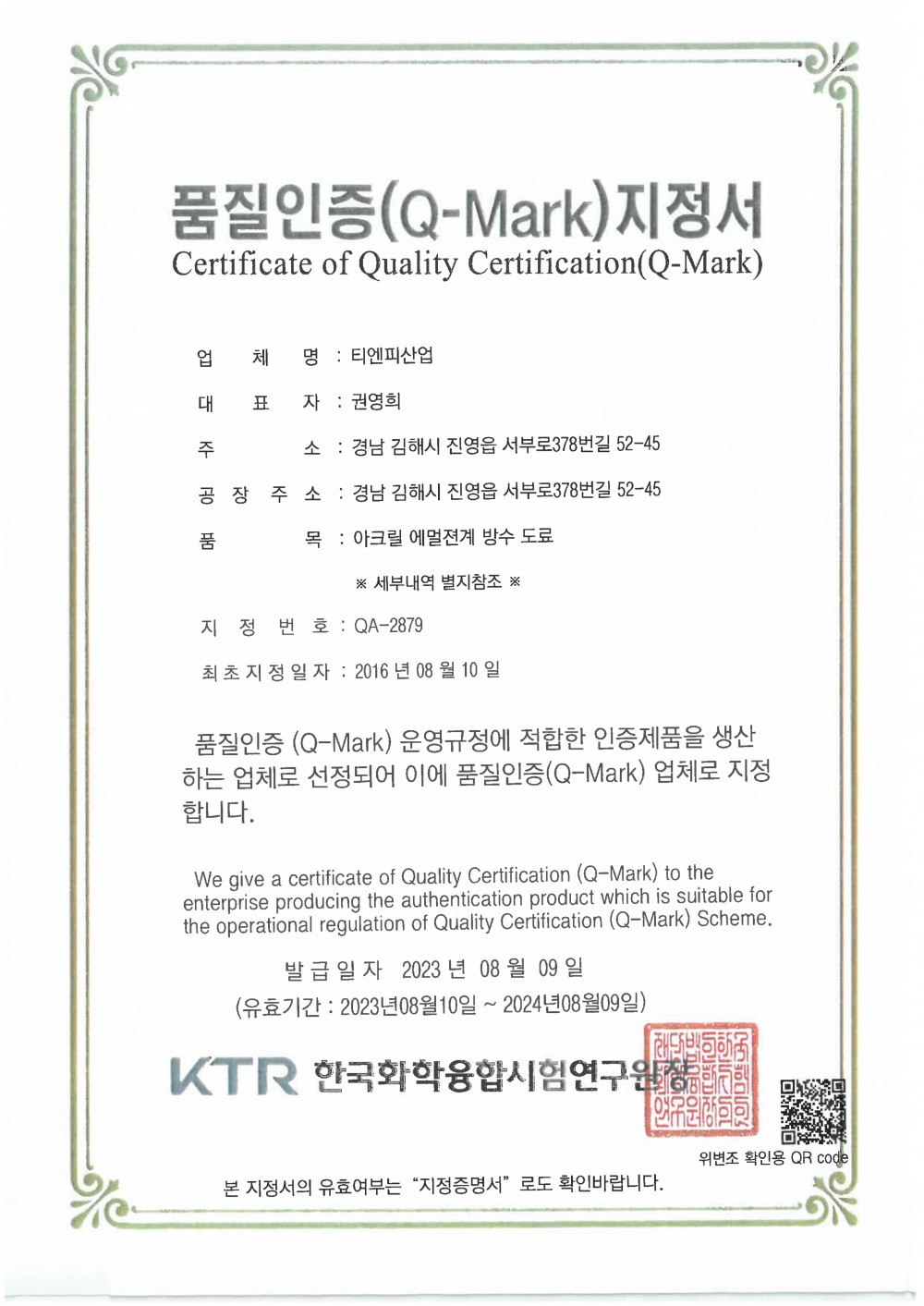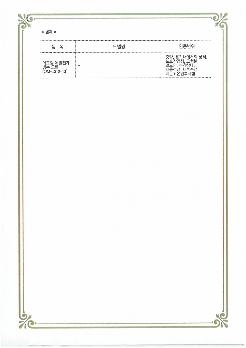 Q-Mark [아크릴 에멀젼계 방수 도료] 페이지 정보 작성자 관리자 댓글 댓글 0건 조회Hit 81회 작성일Date 24-02-05 16:37 본문 목록 이전글Q-Mark [자전거용 도료] 24.02.05 다음글단체표준인증서 [미끄럼방지 포장재] 24.02.05