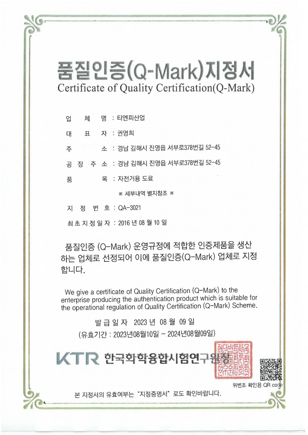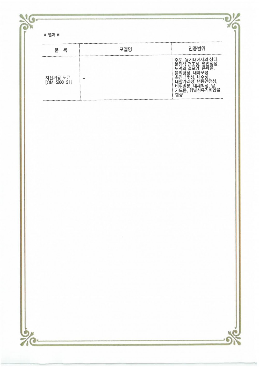 Q-Mark [자전거용 도료] 페이지 정보 작성자 관리자 댓글 댓글 0건 조회Hit 80회 작성일Date 24-02-05 16:38 본문 목록 이전글Q-Mark [콘크리트 에폭시수지계 수조용 방식도료] 24.02.05 다음글Q-Mark [아크릴 에멀젼계 방수 도료] 24.02.05