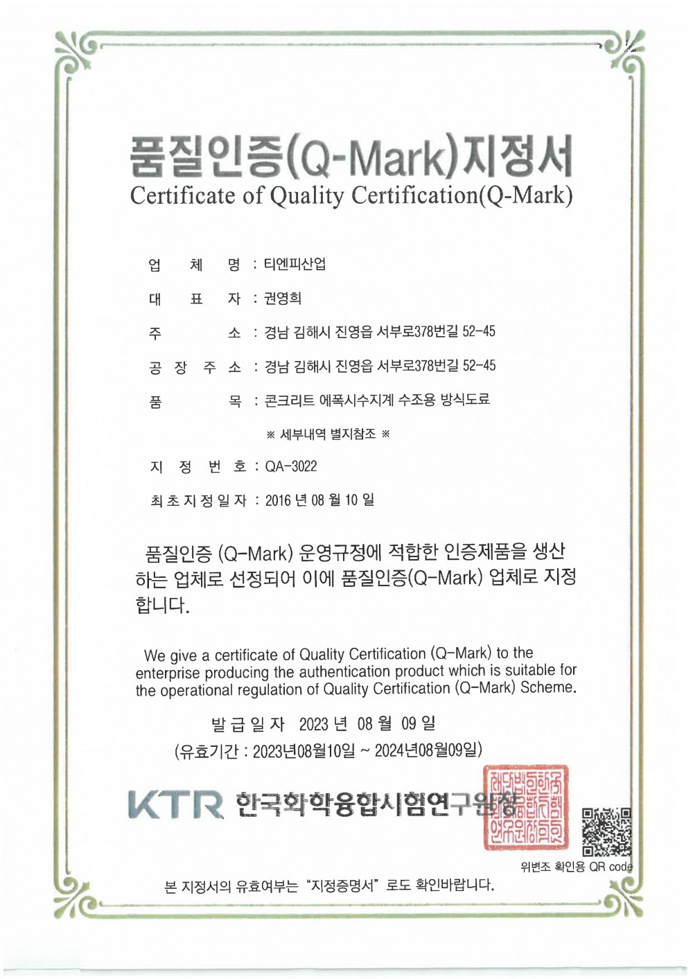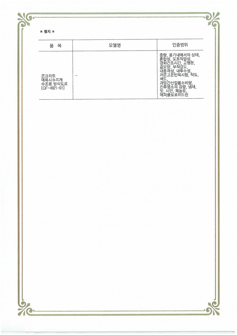 Q-Mark [콘크리트 에폭시수지계 수조용 방식도료] 페이지 정보 작성자 관리자 댓글 댓글 0건 조회Hit 83회 작성일Date 24-02-05 16:38 본문 목록 이전글여성기업 확인서 24.02.05 다음글Q-Mark [자전거용 도료] 24.02.05