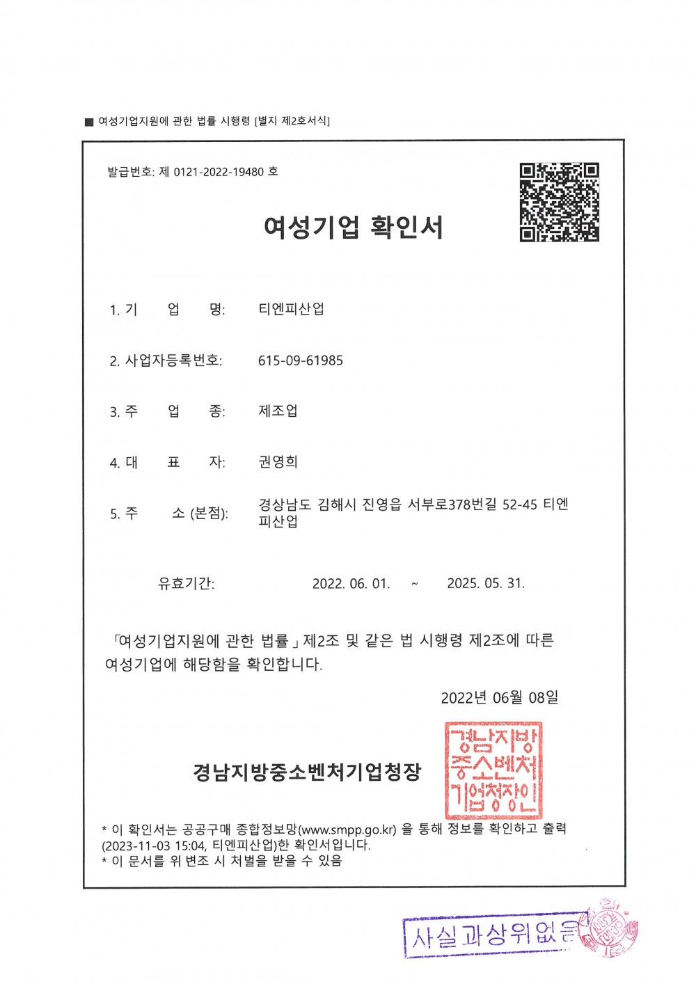 여성기업 확인서 페이지 정보 작성자 관리자 댓글 댓글 0건 조회Hit 84회 작성일Date 24-02-05 16:42 본문 목록 이전글중소기업 확인서 24.02.05 다음글Q-Mark [콘크리트 에폭시수지계 수조용 방식도료] 24.02.05