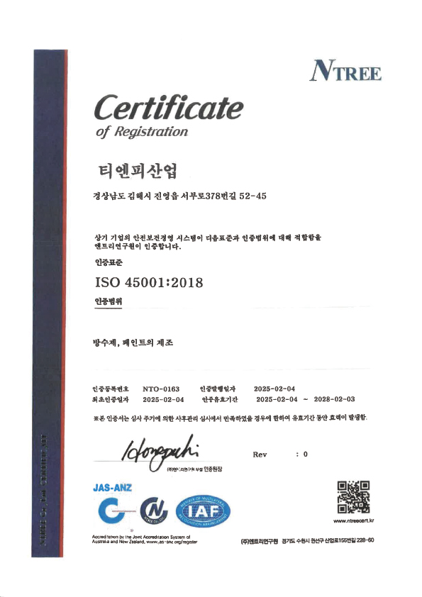 ISO 45001:2018 인증표준 페이지 정보 작성자 관리자 댓글 댓글 0건 조회Hit 44회 작성일Date 25-07-08 15:35 본문 방수제, 페인트의 제조 목록 이전글ISO 9001:2015 인증표준 25.07.08 다음글특허증 [친환경 수용성 페인트 도장 시스템] 24.02.05